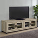 Upgrade your entertainment space with this 79-inch TV stand, featuring a contemporary boxy silhouette and smooth surfaces. The distressed pine finish enhances its rustic appeal, while the glass-paneled cabinet doors add a refined touch. Adjustable shelves provide customizable storage for media devices, gaming consoles, and décor. The spacious tabletop supports TVs up to 85 inches, making it ideal for both stand-alone and wall-mounted configurations. Black metal legs and sleek black handles create a bold contrast, offering an industrial-inspired accent to any modern or farmhouse-style home. Key Features: • Modern 79-inch TV stand with sleek glass doors for a sophisticated touch • Distressed pine wood finish brings rustic warmth to contemporary spaces • Adjustable shelves offer flexible storage for electronics and accessories • Engineered wood and metal construction ensures long-lasting durability • Supports TVs up to 85 inches, perfect for large entertainment setups • Black metal legs and handles enhance the industrial-chic aesthetic